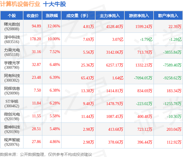 个股表现方面,计算机设备行业当日领涨股为曙光数创(920808),该股当日报收94.89,上涨12.06%,成交量4.81万,主力资金净流入4528.4万元。淳中科技(603516)以上涨10.0%紧随其后,该股当日成交量7.69万,主力资金净流入3.07亿元。除此之外,力鼎光电(605118)、宇瞳光学(300790)、同有科技(300302)均进入当日牛股之列。具体个股列表见下表: