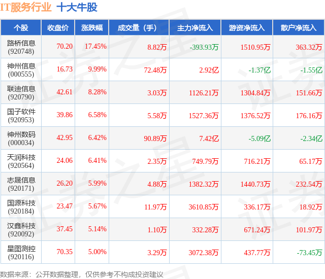 个股表现方面,IT服务行业当日领涨股为路桥信息(920748),该股当日报收70.2,上涨17.45%,成交量8.82万,主力资金净流出393.93万元。神州信息(000555)以上涨9.99%紧随其后,该股当日成交量72.48万,主力资金净流入2.92亿元。除此之外,联迪信息(920790)、国子软件(920953)、神州数码(000034)均进入当日牛股之列。具体个股列表见下表: