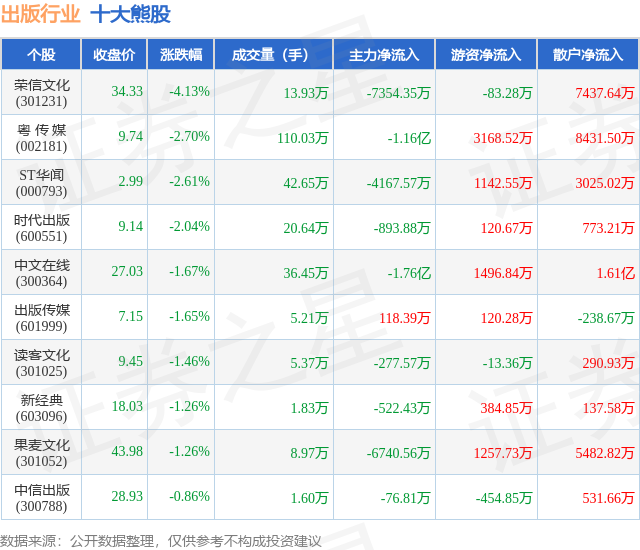 个股表现方面,出版行业当日领跌股为荣信文化(301231),该股当日报收34.33,下跌4.13%,成交量13.93万,主力资金净流出7354.35万元。粤 传 媒(002181)以下跌2.7%紧随其后,该股当日成交量110.03万,主力资金净流出1.16亿元。除此之外,ST华闻(000793)、时代出版(600551)、中文在线(300364)均进入当日熊股之列。具体个股列表见下表: