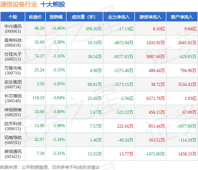 个股表现方面,通信设备行业当日领跌股为中兴通讯(000063),该股当日报收46.2,下跌6.46%,成交量399.2万,主力资金净流出17.13亿元。震有科技(688418)以下跌3.3%紧随其后,该股当日成交量10.19万,主力资金净流出4072.94万元。除此之外,仕佳光子(688313)、万隆光电(300710)、实达集团(600734)均进入当日熊股之列。具体个股列表见下表: