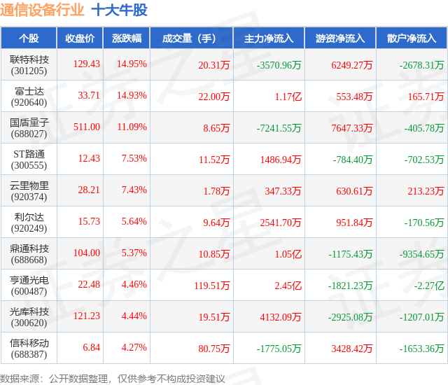 个股表现方面,通信设备行业当日领涨股为联特科技(301205),该股当日报收129.43,上涨14.95%,成交量20.31万,主力资金净流出3570.96万元。富士达(920640)以上涨14.93%紧随其后,该股当日成交量22.0万,主力资金净流入1.17亿元。除此之外,国盾量子(688027)、ST路通(300555)、云里物里(920374)均进入当日牛股之列。具体个股列表见下表: