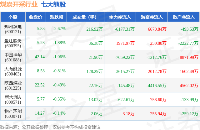 个股表现方面,煤炭开采行业当日领跌股为郑州煤电(600121),该股当日报收5.83,下跌2.67%,成交量216.92万,主力资金净流出6177.31万元。盘江股份(600395)以下跌1.88%紧随其后,该股当日成交量36.38万,主力资金净流入1971.97万元。除此之外,中国神华(601088)、大有能源(600403)、陕西煤业(601225)均进入当日熊股之列。具体个股列表见下表: