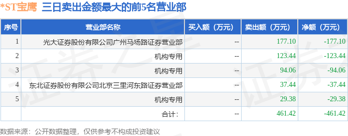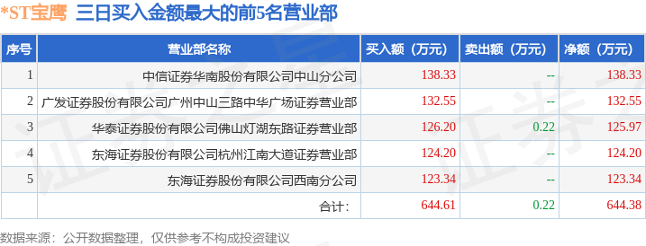 证券之星消息,沪深交易所2025年10月29日公布的交易公开信息显示,*ST宝鹰(002047)因连续三个交易日内,涨幅偏离值累计达到12%的ST证券、*ST证券和未完成股改证券登上龙虎榜。此次是近5个交易日内第1次上榜。