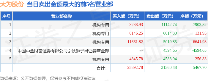 证券之星消息,沪深交易所2025年10月29日公布的交易公开信息显示,大为股份(002213)因日换手率达到20%的前5只证券登上龙虎榜。此次是近5个交易日内第2次上榜。