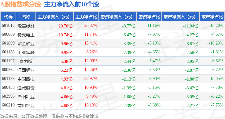 资金流向方面,A股指数(000002)成份股当日主力资金净流出合计1.03亿元,游资资金净流出合计52.39亿元,散户资金净流入合计53.42亿元。成份股资金流向详情见下表: