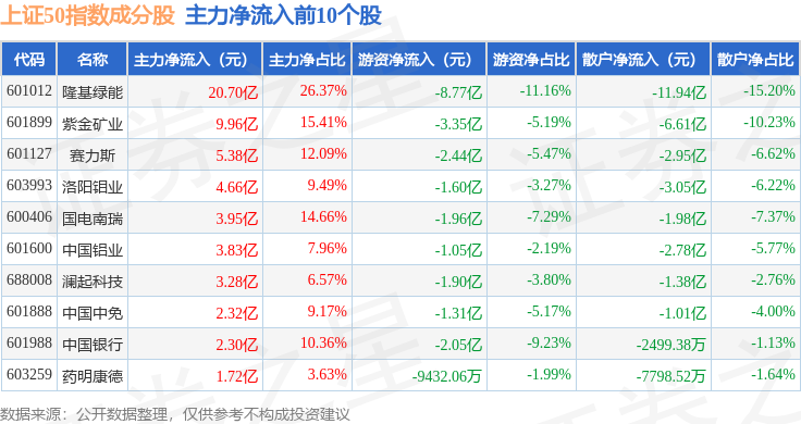 资金流向方面,上证50(000016)指数成份股当日主力资金净流入合计1.0亿元,游资资金净流入合计1819.77万元,散户资金净流出合计1.18亿元。成份股资金流向详情见下表: