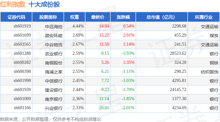 证券之星消息,10月29日,红利指数(000015)报收于3108.07点,跌0.5%,成交314.12亿元,换手率0.3%。当日该指数成份股中,上涨的有17家,潞安环能以2.91%的涨幅领涨,下跌的有32家,厦门国贸以4.11%的跌幅领跌。