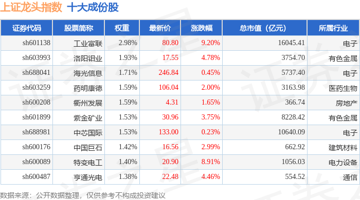 证券之星消息,10月29日,上证龙头(000065)指数报收于3685.82点,涨1.46%,成交1734.46亿元,换手率0.49%。当日该指数成份股中,上涨的有66家,工业富联以9.2%的涨幅领涨,下跌的有28家,工商银行以2.0%的跌幅领跌。