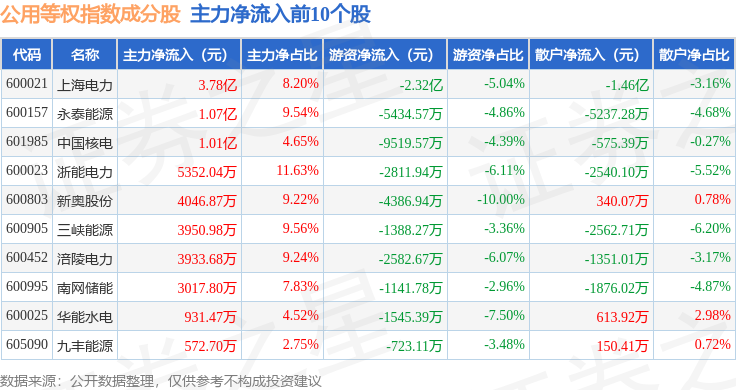 资金流向方面,公用等权(000079)指数成份股当日主力资金净流入合计2.86亿元,游资资金净流出合计6.21亿元,散户资金净流入合计3.36亿元。成份股资金流向详情见下表: