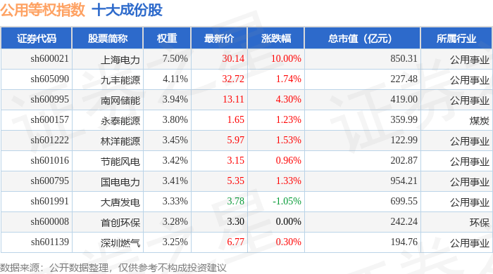 公用等权(000079)指数十大成份股详情如下: