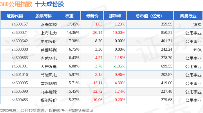证券之星消息,10月29日,380公用(000113)指数报收于3233.09点,涨2.63%,成交94.59亿元,换手率1.74%。当日该指数成份股中,上涨的有13家,上海电力以10.0%的涨幅领涨,下跌的有2家,大唐发电以1.05%的跌幅领跌。