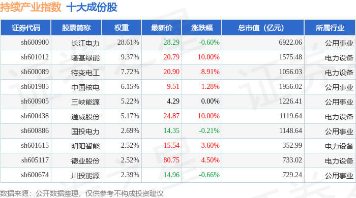 证券之星消息,10月29日,持续产业(000114)指数报收于1301.87点,涨3.69%,成交482.32亿元,换手率1.67%。当日该指数成份股中,上涨的有32家,阿特斯以19.97%的涨幅领涨,下跌的有6家,川投能源以0.66%的跌幅领跌。