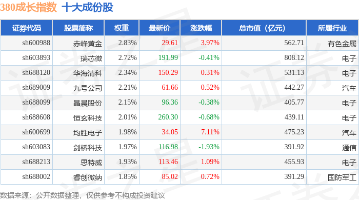 证券之星消息,10月29日,380成长(000117)指数报收于4391.75点,涨1.7%,成交712.89亿元,换手率2.13%。当日该指数成份股中,上涨的有92家,金盘科技以11.19%的涨幅领涨,下跌的有27家,安集科技以5.78%的跌幅领跌。