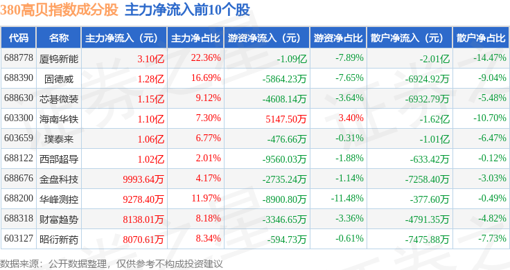 资金流向方面,380高贝(000137)指数成份股当日主力资金净流出合计8.82亿元,游资资金净流出合计1.52亿元,散户资金净流入合计10.35亿元。成份股资金流向详情见下表: