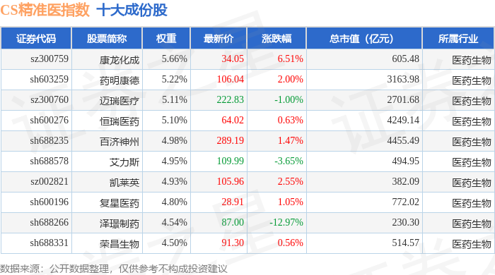 CS精准医(000863)指数十大成份股详情如下: