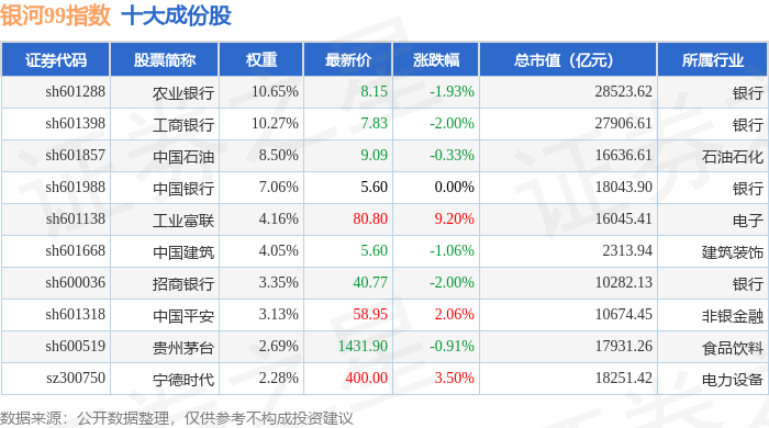 证券之星消息,10月29日,银河99(000959)指数报收于8236.22点,涨0.05%,成交3524.78亿元,换手率0.5%。当日该指数成份股中,上涨的有55家,阳光电源以15.44%的涨幅领涨,下跌的有41家,成都银行以5.74%的跌幅领跌。