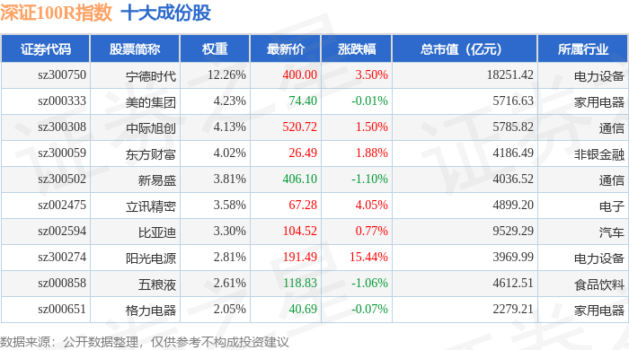 深证100R(399004)指数十大成份股详情如下: