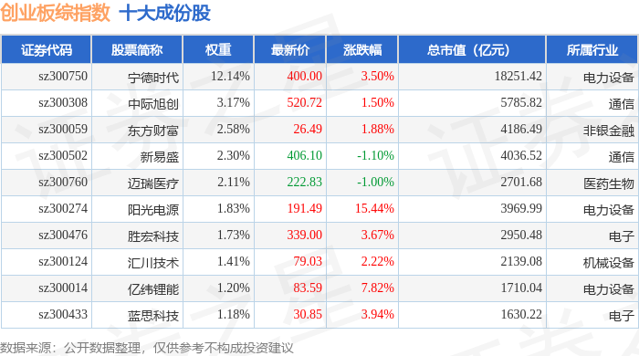 创业板综(399102)指数十大成份股详情如下: