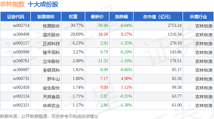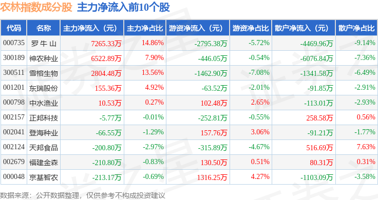 资金流向方面,农林指数(399231)成份股当日主力资金净流出合计1882.52万元,游资资金净流出合计2480.54万元,散户资金净流入合计4363.06万元。成份股资金流向详情见下表: