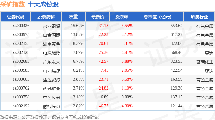 采矿指数(399232)十大成份股详情如下: