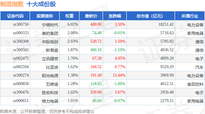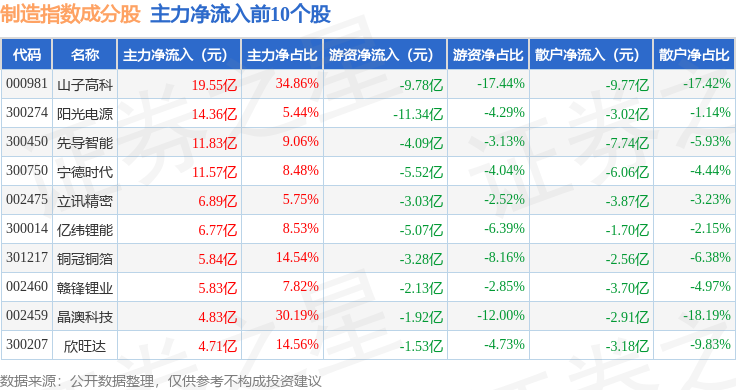 资金流向方面,制造指数(399233)成份股当日主力资金净流入合计7.34亿元,游资资金净流出合计37.88亿元,散户资金净流入合计30.54亿元。成份股资金流向详情见下表: