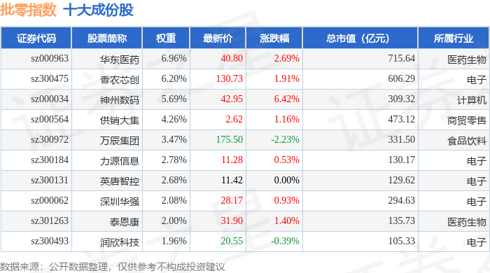 资金流向方面,批零指数(399236)成份股当日主力资金净流入合计3.02亿元,游资资金净流出合计6.44亿元,散户资金净流入合计3.42亿元。成份股资金流向详情见下表: