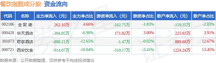资金流向方面,餐饮指数(399238)成份股当日主力资金净流出合计1934.22万元,游资资金净流出合计243.38万元,散户资金净流入合计2177.6万元。成份股资金流向详情见下表: