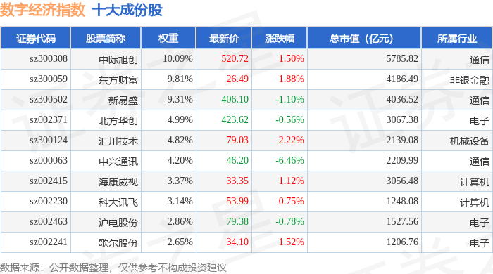 证券之星消息,10月29日,数字经济(399262)指数报收于2949.25点,涨0.98%,成交1946.86亿元,换手率3.46%。当日该指数成份股中,上涨的有41家,三环集团以10.25%的涨幅领涨,下跌的有9家,中兴通讯以6.46%的跌幅领跌。