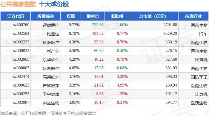 证券之星消息,10月29日,公共健康(399277)指数报收于2777.06点,涨0.49%,成交195.72亿元,换手率1.97%。当日该指数成份股中,上涨的有25家,吉林敖东以4.95%的涨幅领涨,下跌的有24家,中红医疗以4.61%的跌幅领跌。