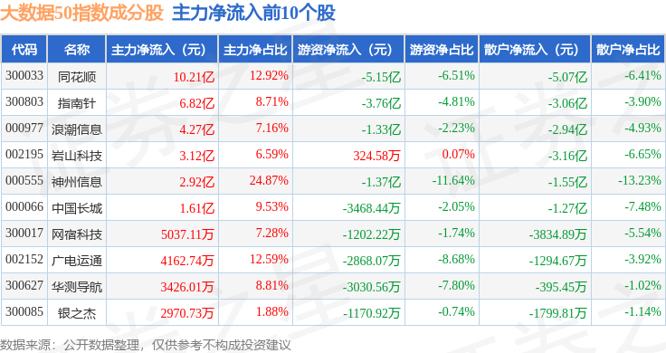 资金流向方面,大数据50(399282)指数成份股当日主力资金净流入合计3010.84万元,游资资金净流出合计1.61亿元,散户资金净流入合计1.31亿元。成份股资金流向详情见下表: