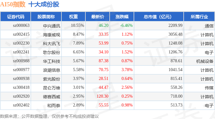 证券之星消息,10月29日,AI50(399284)指数报收于4110.57点,涨0.2%,成交760.1亿元,换手率3.19%。当日该指数成份股中,上涨的有33家,科大国创以12.64%的涨幅领涨,下跌的有16家,中兴通讯以6.46%的跌幅领跌。