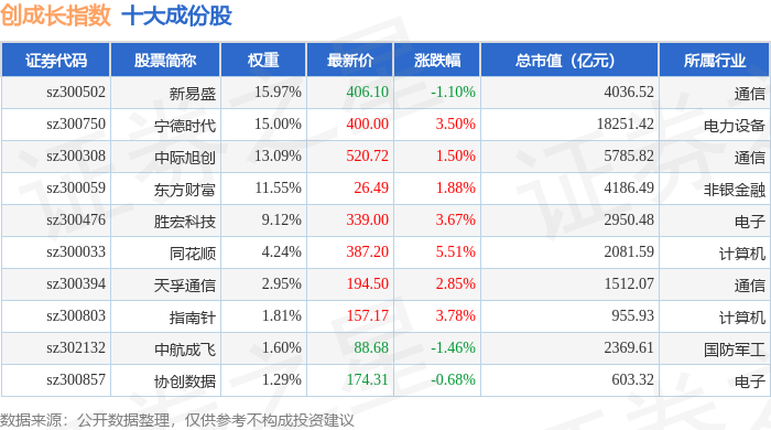 证券之星消息,10月29日,创成长(399296)指数报收于6383.35点,涨1.87%,成交2160.18亿元,换手率4.72%。当日该指数成份股中,上涨的有33家,阳光电源以15.44%的涨幅领涨,下跌的有17家,顺网科技以5.8%的跌幅领跌。