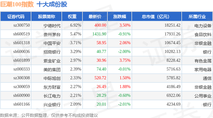证券之星消息,10月29日,巨潮100(399313)指数报收于5588.55点,涨0.9%,成交3267.42亿元,换手率0.45%。当日该指数成份股中,上涨的有54家,阳光电源以15.44%的涨幅领涨,下跌的有44家,中兴通讯以6.46%的跌幅领跌。