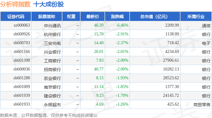 证券之星消息,10月29日,分析师指数(399354)报收于8573.91点,涨1.22%,成交2750.29亿元,换手率0.53%。当日该指数成份股中,上涨的有57家,隆基绿能以10.0%的涨幅领涨,下跌的有40家,中兴通讯以6.46%的跌幅领跌。