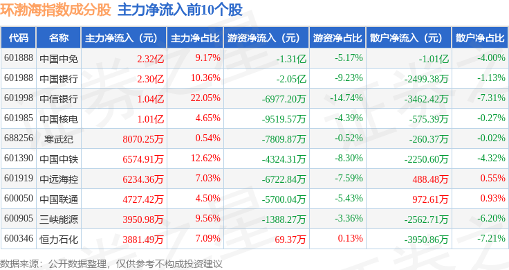 资金流向方面,环渤海(399357)指数成份股当日主力资金净流出合计19.97亿元,游资资金净流入合计9.98亿元,散户资金净流入合计9.99亿元。成份股资金流向详情见下表:
