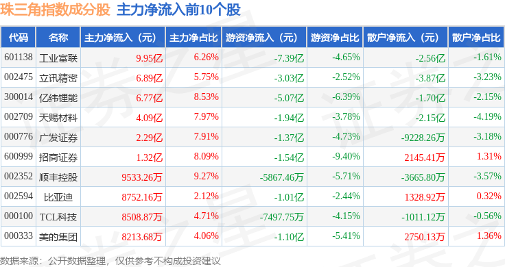 资金流向方面,珠三角(399356)指数成份股当日主力资金净流出合计4092.29万元,游资资金净流出合计15.58亿元,散户资金净流入合计15.99亿元。成份股资金流向详情见下表: