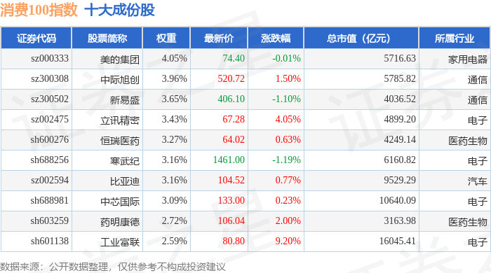 证券之星消息,10月29日,消费100(399364)指数报收于11445.05点,涨0.86%,成交3301.96亿元,换手率1.5%。当日该指数成份股中,上涨的有64家,三环集团以10.25%的涨幅领涨,下跌的有35家,中兴通讯以6.46%的跌幅领跌。