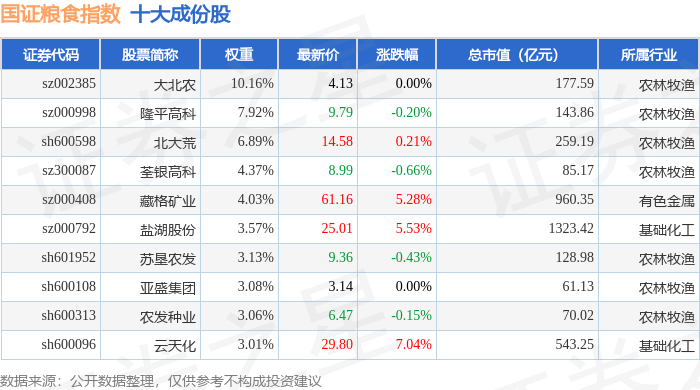 证券之星消息,10月29日,国证粮食(399365)指数报收于12886.45点,涨1.48%,成交195.45亿元,换手率1.97%。当日该指数成份股中,上涨的有33家,川恒股份以10.0%的涨幅领涨,下跌的有13家,万向德农以2.17%的跌幅领跌。