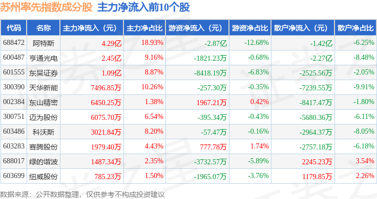 资金流向方面,苏州率先(399410)指数成份股当日主力资金净流出合计2.78亿元,游资资金净流出合计8992.87万元,散户资金净流入合计3.68亿元。成份股资金流向详情见下表: