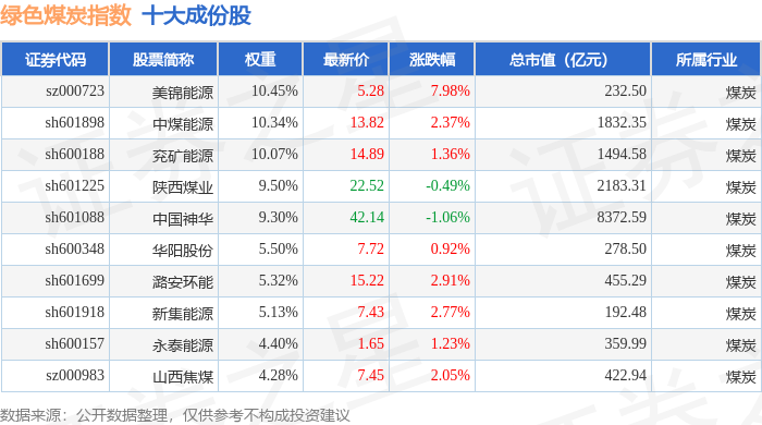 证券之星消息,10月29日,绿色煤炭(399436)指数报收于4210.28点,涨1.91%,成交134.6亿元,换手率2.01%。当日该指数成份股中,上涨的有23家,美锦能源以7.98%的涨幅领涨,下跌的有4家,郑州煤电以2.67%的跌幅领跌。