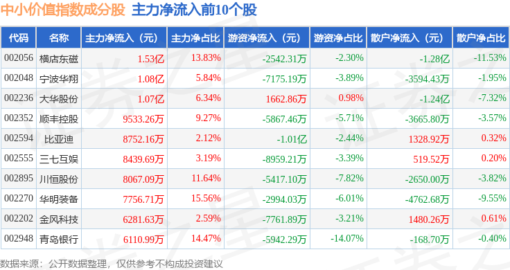 资金流向方面,中小价值(399604)指数成份股当日主力资金净流出合计3.75亿元,游资资金净流出合计9.16亿元,散户资金净流入合计12.91亿元。成份股资金流向详情见下表: