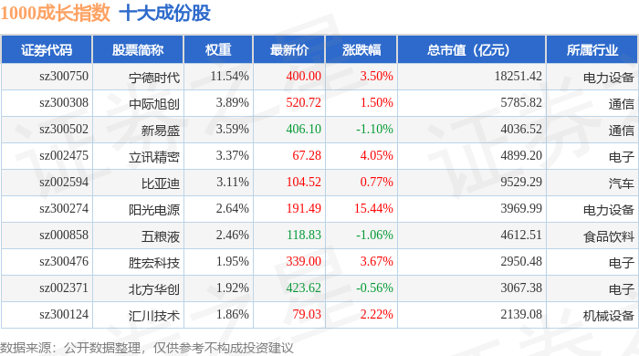 证券之星消息,10月29日,1000成长(399630)指数报收于1827.15点,涨2.37%,成交4530.25亿元,换手率3.02%。当日该指数成份股中,上涨的有229家,阳光电源以15.44%的涨幅领涨,下跌的有98家,开立医疗以11.39%的跌幅领跌。