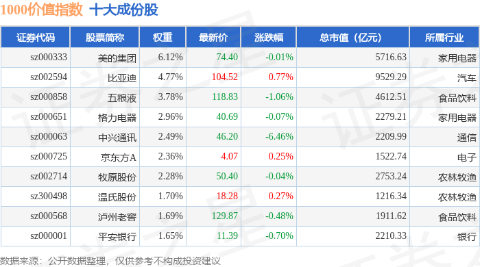1000价值(399631)指数十大成份股详情如下: