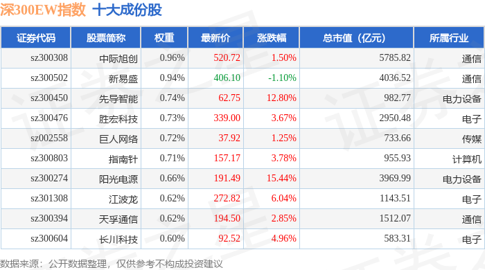 证券之星消息,10月29日,深300EW(399633)指数报收于6262.12点,涨2.09%,成交5339.8亿元,换手率1.8%。当日该指数成份股中,上涨的有231家,阳光电源以15.44%的涨幅领涨,下跌的有65家,中兴通讯以6.46%的跌幅领跌。