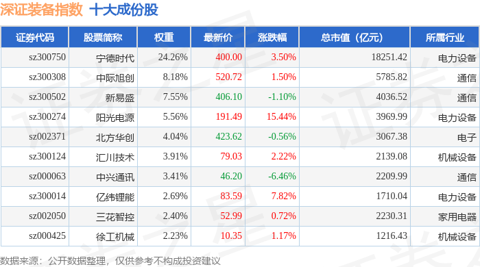 证券之星消息,10月29日,深证装备(399636)指数报收于8144.6点,涨2.67%,成交2223.83亿元,换手率3.48%。当日该指数成份股中,上涨的有65家,阳光电源以15.44%的涨幅领涨,下跌的有14家,中兴通讯以6.46%的跌幅领跌。