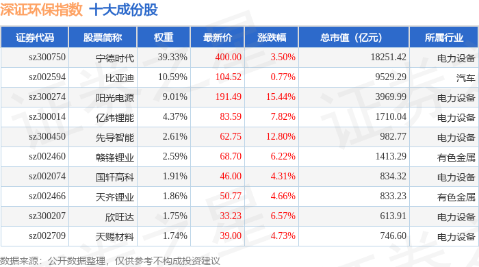 证券之星消息,10月29日,深证环保(399638)指数报收于7895.97点,涨4.98%,成交1266.21亿元,换手率2.38%。当日该指数成份股中,上涨的有39家,阳光电源以15.44%的涨幅领涨,下跌的有1家,富临精工以2.25%的跌幅领跌。