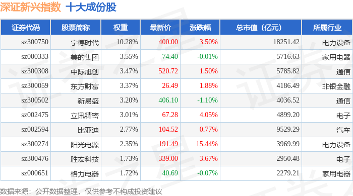 深证新兴(399641)指数十大成份股详情如下:
