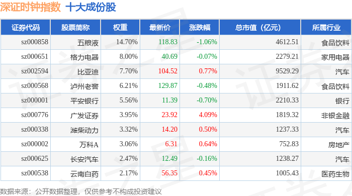 证券之星消息,10月29日,深证时钟(399644)指数报收于3568.37点,涨0.93%,成交695.76亿元,换手率2.19%。当日该指数成份股中,上涨的有56家,海默科技以9.63%的涨幅领涨,下跌的有37家,皇氏集团以2.19%的跌幅领跌。