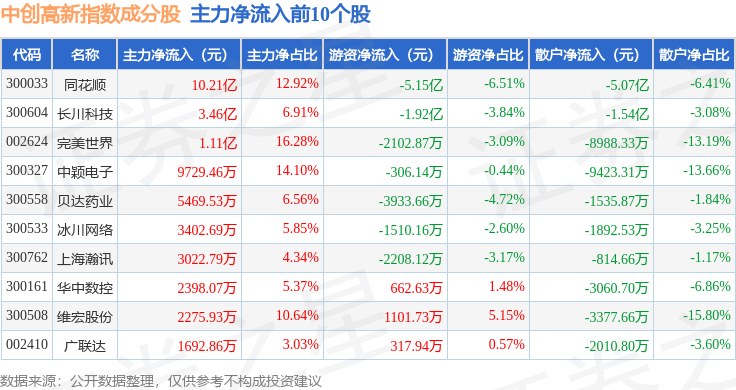 资金流向方面,中创高新(399652)指数成份股当日主力资金净流入合计2.83亿元,游资资金净流出合计4.73亿元,散户资金净流入合计1.9亿元。成份股资金流向详情见下表: