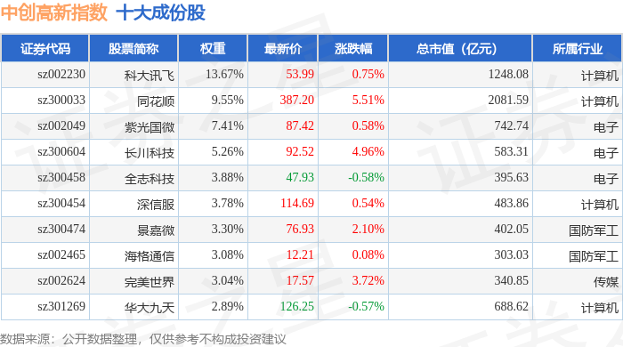 中创高新(399652)指数十大成份股详情如下: